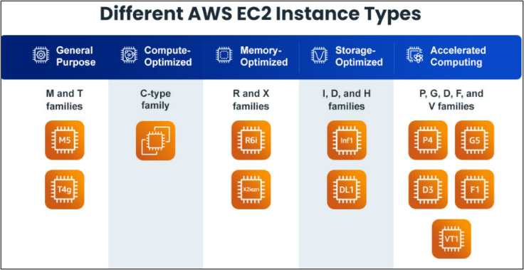AWS EC2 (Elastic Compute Cloud) offers a variety of instance kinds, each designed to meet the needs of different workloads. Here are some examples of EC2 instance types that are commonly used: